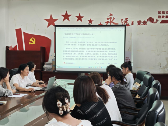 随后,全体党员集中学习了“求是网”文章《锲而不舍落实中央八项规定精神,以优良党风引领社风民风》,《党政机关厉行节约反对浪费条例》等文件,文件强调中央八项规定精神是长期有效的铁规矩、硬杠杠,必须以“钉钉子精神”一抓到底。党员们围绕“四风”问题的隐蔽性、变异性展开讨论,并结合高校实际,提出在学术诚信、师德师风建设中发挥表率作用的具体举措。