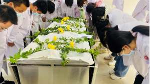 无言大爱,感恩长存。伴随着肃穆的音乐,各班代表在实验室遗体台献上鲜花并诚挚鞠躬。一束束白色的花朵,一次次由衷的鞠躬,诠释着别样的人间仁爱,寄托着伟大的师生恩情。